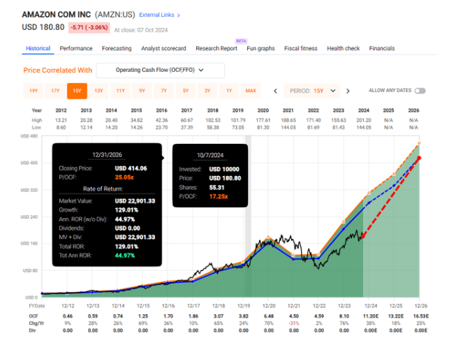 Volgens de verwachtingen zal de operationele cash flow van Amazon naar verwachting blijven groeien met een percentage van 17% tot 20% per jaar voor de rest van dit decennium. Dit duidt erop dat het aandeel momenteel misschien wel erg aantrekkelijk gewaardeerd is, vooral wanneer we rekening houden met de sterke groeiverwachtingen in opkomende sectoren zoals cloud computing en AI, waar Amazon een leidende rol in speelt.