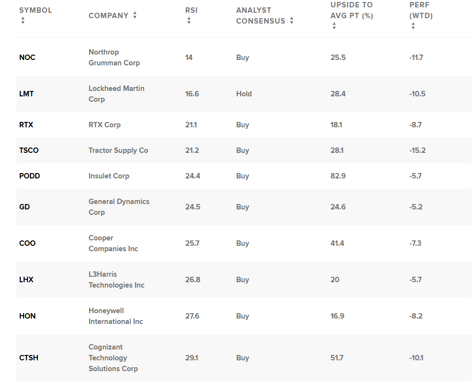 Terwijl chips stijgen, gebeurt het tegenovergestelde in defensie en industriële aandelen. Bedrijven zoals Lockheed Martin, Northrop Grumman en RTX zijn technisch zwaar oversold, met RSI niveaus rond de 15 tot 25. Dat wijst op sterke verkoopdruk.
