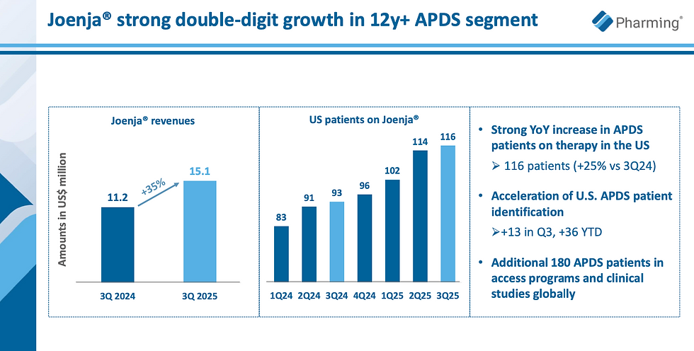 Een belangrijke recente ontwikkeling is de goedkeuring door de Amerikaanse FDA voor gebruik bij kinderen van 4 tot 11 jaar. Daarmee wordt Joenja de eerste beschikbare behandeling voor deze jongere patiëntengroep. Dat vergroot het commerciële potentieel aanzienlijk, zeker als APDS vaker blijkt voor te komen dan tot nu toe werd aangenomen. Volgens Pharming zijn daar steeds sterkere aanwijzingen voor.