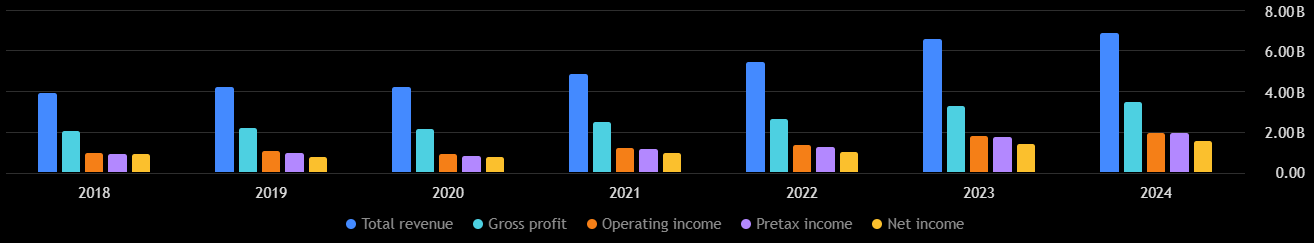 Ferrari boekte in 2024 een omzet van €6 677 miljoen, met een winstgroei van 21 % en een EBITDA-marge van 38,3 %.