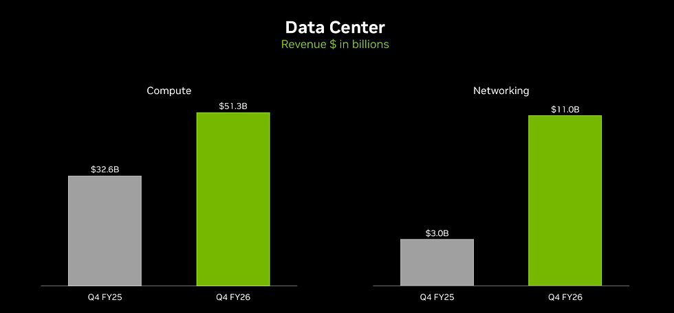 De absolute uitblinker in het kwartaal was opnieuw de datacenterdivisie. Deze tak genereerde 62,3 miljard dollar omzet, een stijging van 75 procent ten opzichte van een jaar eerder en 22 procent hoger dan in het derde kwartaal. Daarmee overtrof Nvidia ook hier de verwachtingen, die rond de 60 miljard dollar lagen.