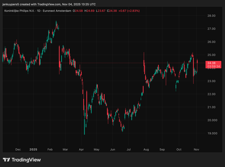 Philips lijkt de neerwaartse spiraal van 2023 en 2024 achter zich te laten. De sterke orderinstroom, kasstroomverbetering en winstherstel in belangrijke divisies geven beleggers nieuw vertrouwen. De beurskoers beweegt rond de €24,40, een stijging van bijna 3% na de cijfers.